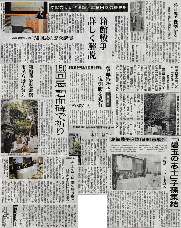 「函館碧血会」は今年、百五十回忌追悼行事を幾つか計画しています。六月二十三日から二十五日にかけて、「箱館戦争と碧血碑」の講演会(函館市中央図書館)や碧血碑前慰霊祭、大法要(実行寺)、記念集会(五島軒本店)を予定しています。一緒に碧血碑の意義について考えてみませんか。