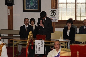 榎本家からは、四代目の隆充さんと奥様、それに五代目の隆一郎さんにご参加頂きました。隆充さんは「ここにご参加されている方々は、ご遺族として参加されているが、私どもの武揚は生き残ってしまったので、申し訳なく肩身が狭い」と、軽いジョークの後「旧幕府軍の遺体は、柳川熊吉さんら函館の心ある人たちによって埋葬され、後に碧血碑が建てられた。函館碧血会の方々には、一五〇年もの間休むことなく供養して頂いて感謝している。」と述べられました。