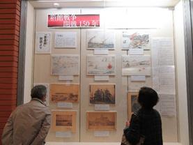 今回、函館中央図書館では、箱館戦争戦没者百五十回忌を記念して、二つのコーナーで紹介・展示されています。「箱館戦争開戦百五十年」は、関連の年表と共に「麦叢録付図」や図書館が所蔵している幕末・明治の古写真などを展示しています。期間は昨年六月三十日から本年三月二十八日迄です。