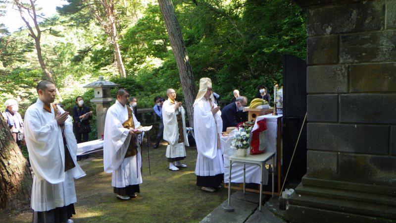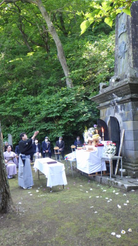 当日、「碑前慰霊祭」に参加できたのは、函館碧血会の役員・事務局員のみの関係者で、20名の出席というさみしい慰霊祭でした。ですが、慰霊祭の進行は、通常とほぼ変わりなく、碧血碑前への折り鶴奉納の後、実行寺副ご住職と僧侶の方々からの「お勤め」を頂き、ご焼香、散華の儀を行い、無事に碧血碑の「碑前慰霊」を済ませることが出来ましたので、ここにご報告いたします。