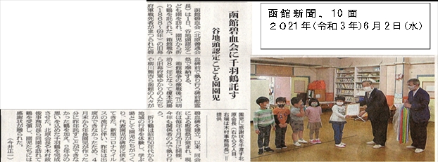 函館碧血会は、6 月 1 日(火)に同子ども園を訪ねて、「折り鶴」を預かり、子ども園にはこれまでの長年にわたる行為に感謝の念を込めて「感謝状」を贈り、その気持ちに応えました。